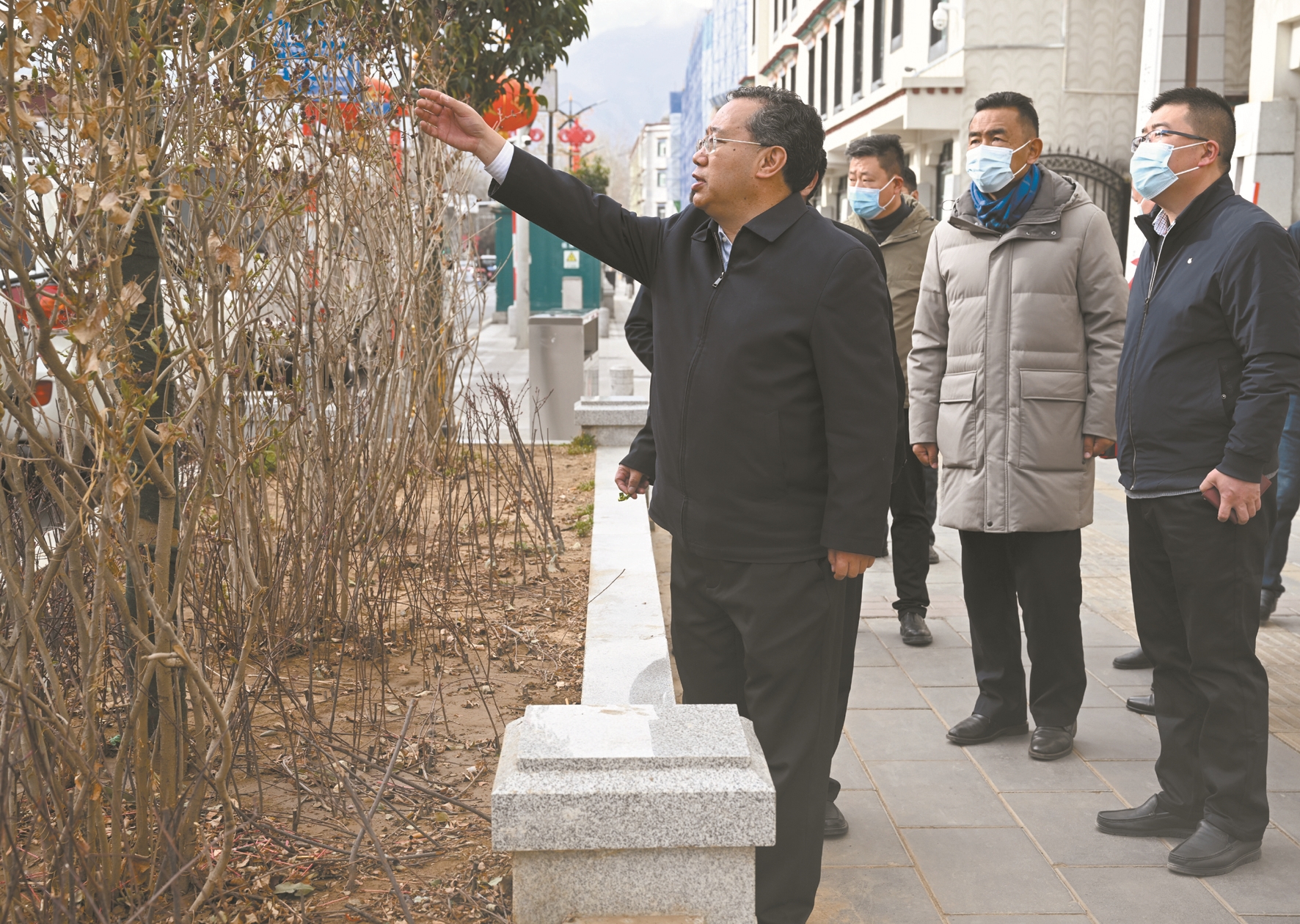 3月15日,西藏自治區(qū)黨委常委、市委書記普布頓珠帶隊(duì)深入城關(guān)區(qū),調(diào)研城市建設(shè)管理工作。圖為普布頓珠在朵森格路中段調(diào)研道路兩旁綠化帶植物缺損問題。拉薩融媒記者 巴桑次仁攝