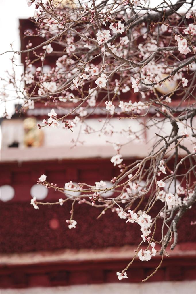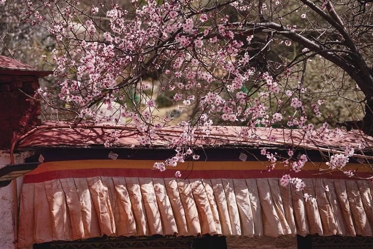 4月的帕邦喀,桃花開得正茂,桃樹枝上早已經(jīng)掛滿了大大小小的花朵,沿著石板臺(tái)階走走停停,可以看到桃樹舒展枝條,朵朵桃花爬上枝頭沐浴著春日的暖陽,在藍(lán)天白云、紅墻金頂?shù)挠骋r之下格外美麗,構(gòu)成一幅絕妙的春景詩(shī)畫。偶爾枝頭傳來清脆的鳥鳴聲,讓這里顯得愈發(fā)靜謐美好。