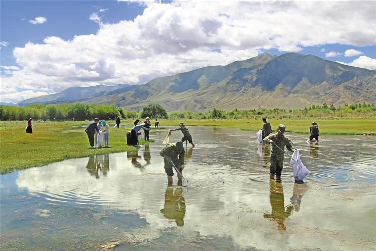 綠水青山就是金山銀山。為全面貫徹黨的二十大精神,充分尊重自然、順應(yīng)自然、保護(hù)自然,提高廣大黨員骨干的綠色環(huán)保意識(shí),近日,日喀則市桑珠孜區(qū)人民武裝部聯(lián)合桑珠孜區(qū)退役軍人事務(wù)局,組織官兵與江當(dāng)鄉(xiāng)、年木鄉(xiāng)退役軍人、民兵黨員在雅江中游河谷黑頸鶴保護(hù)區(qū)開展“呵護(hù)綠水青山”主題黨日活動(dòng)?;顒?dòng)中,桑珠孜區(qū)人民武裝部組織重溫入黨誓詞,隨后,30多名黨員開展拉網(wǎng)式清理水域漂浮物和白色垃圾,給“高原精靈”營造一個(gè)美麗舒適的“家”。