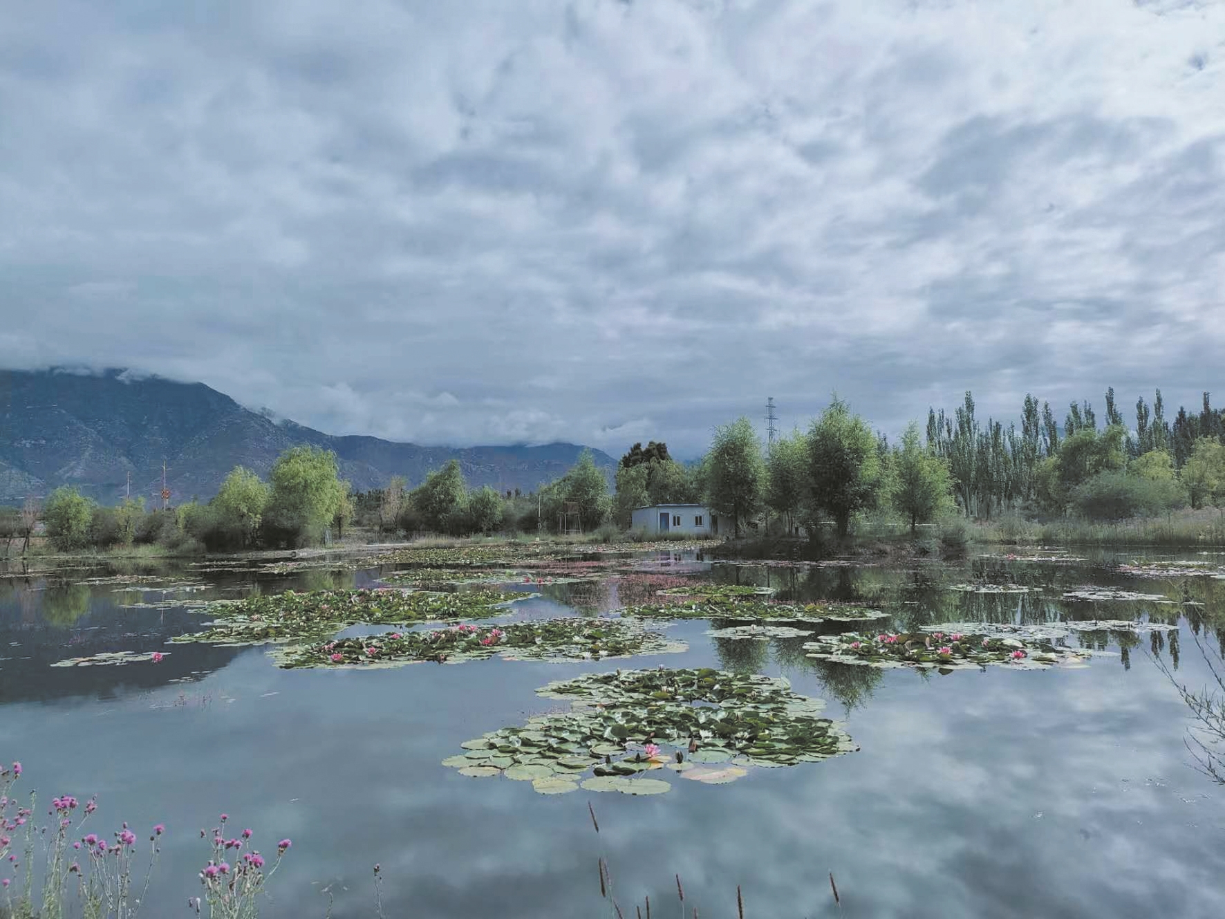 經(jīng)過反復試驗,王興邦從全國各地引進的蓮花種苗逐漸適應高原環(huán)境,從盆里移栽到池塘后,成活率達到90%以上。2019年,在拉薩高新區(qū)管委會的支持下,王興邦又獨自一人到拉薩高新區(qū)濕地公園內(nèi)種植蓮花。據(jù)王興邦回憶,那時的濕地公園僅是一片兩三百畝地的灘涂地,環(huán)境臟亂差,無人管理。夏季漲水后,形成高低不平的洼地,冬季來臨,土壤裸露。