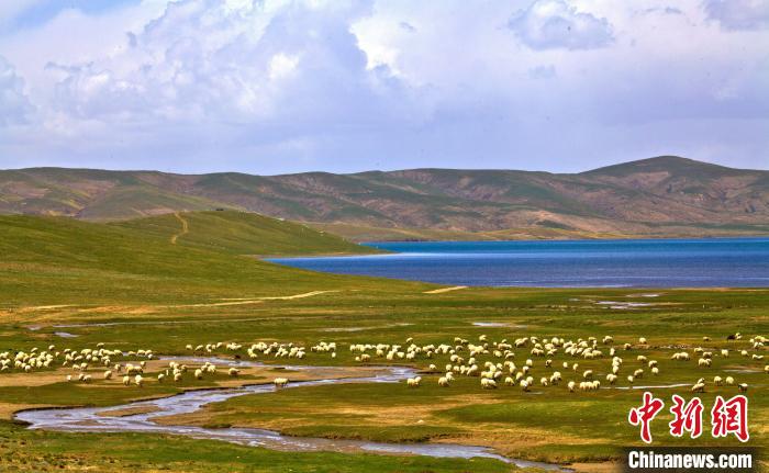 圖為瑪多藏羊在湖邊草地上覓食。(資料圖)瑪多縣委宣傳部 供圖