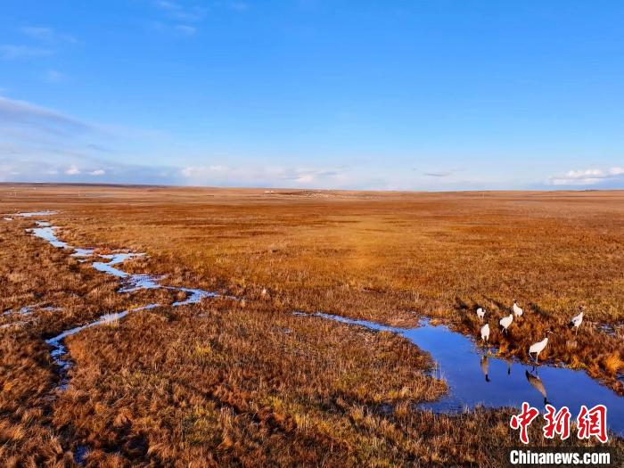 金秋十月,位于青海湖北岸的草原一片金黃。攝影愛好者在青海省海北藏族自治州剛察縣吉爾孟鄉(xiāng)日格加柔地區(qū),拍攝到六只黑頸鶴在這里“安家落戶”,它們或擠在一起沐浴秋日的暖陽,或三五成群覓食嬉戲、閑庭信步,為草原增添了一份靈動與生機(jī)。黑頸鶴被稱為“高原仙子”“鳥類大熊貓”,是全球十五種鶴類中唯一在高原繁殖和棲息的鶴類。