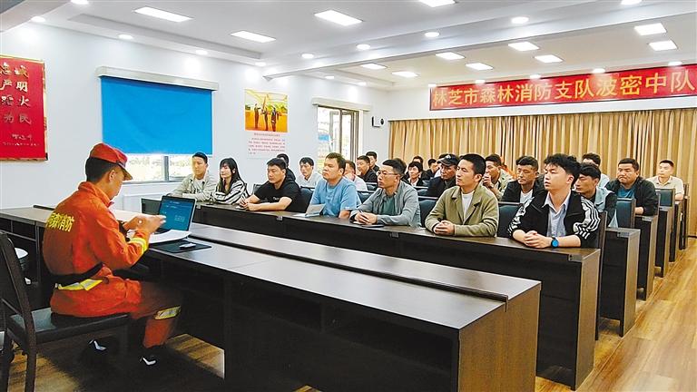 圖為林芝市森林消防支隊(duì)波密中隊(duì)的消防員為護(hù)林員普及緊急避險(xiǎn)和自救常識(shí)。記者 旦增蘭澤 通訊員 李國燾 攝
