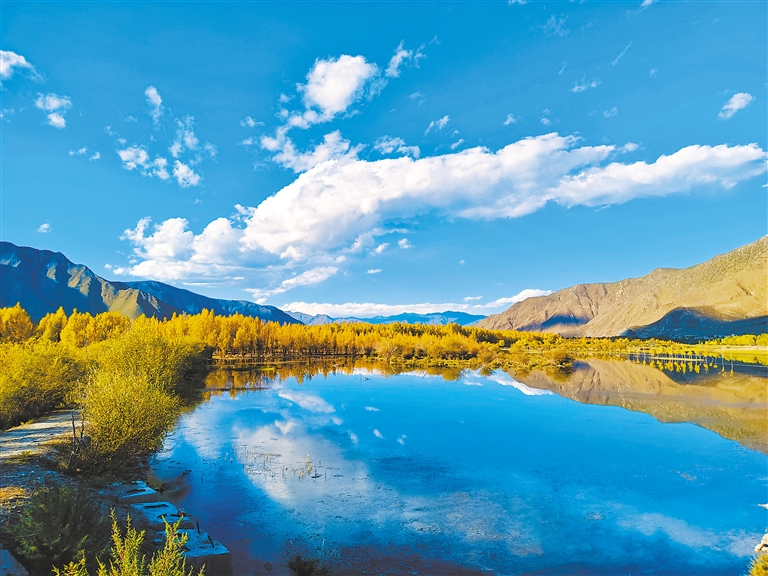 藍(lán)天、白云、湖泊、草原、樹林,拉薩深秋的色彩最為豐富,風(fēng)光最為寧?kù)o、澄澈、壯美。