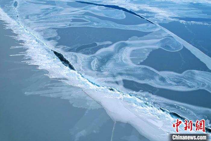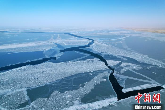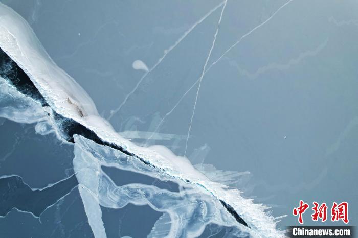 圖為航拍青海湖冰面裂縫。薛蒂攝
