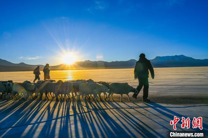 去往湖心島的路程大約3公里,走在冰面上,偶爾響起的冰層破裂聲還是讓人不由得心驚。此刻,幾百只羊宛如一條長長的直線,在牧羊人的指揮下緩慢前行。金色的太陽露出地平線,羊群的影子投射在藍(lán)色的冰面上,美不勝收。