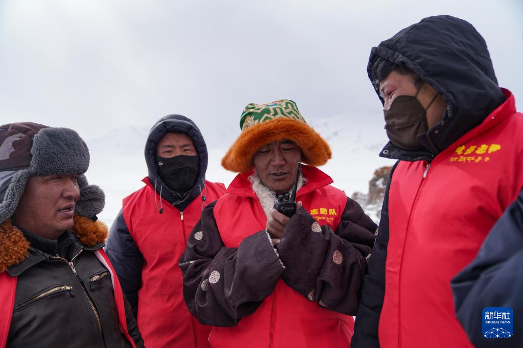 瑪曲鄉(xiāng)長江源環(huán)保志愿隊隊員在巡邏時通過對講機(jī)互相聯(lián)系(2月2日攝)。新華社記者 晉美多吉 攝