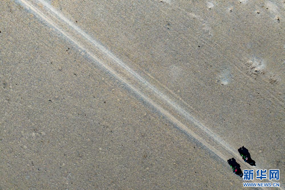 4月14日,野保員在色林錯國家級自然保護(hù)區(qū)進(jìn)行日常巡邏(無人機照片)。新華網(wǎng) 旦增努布 攝