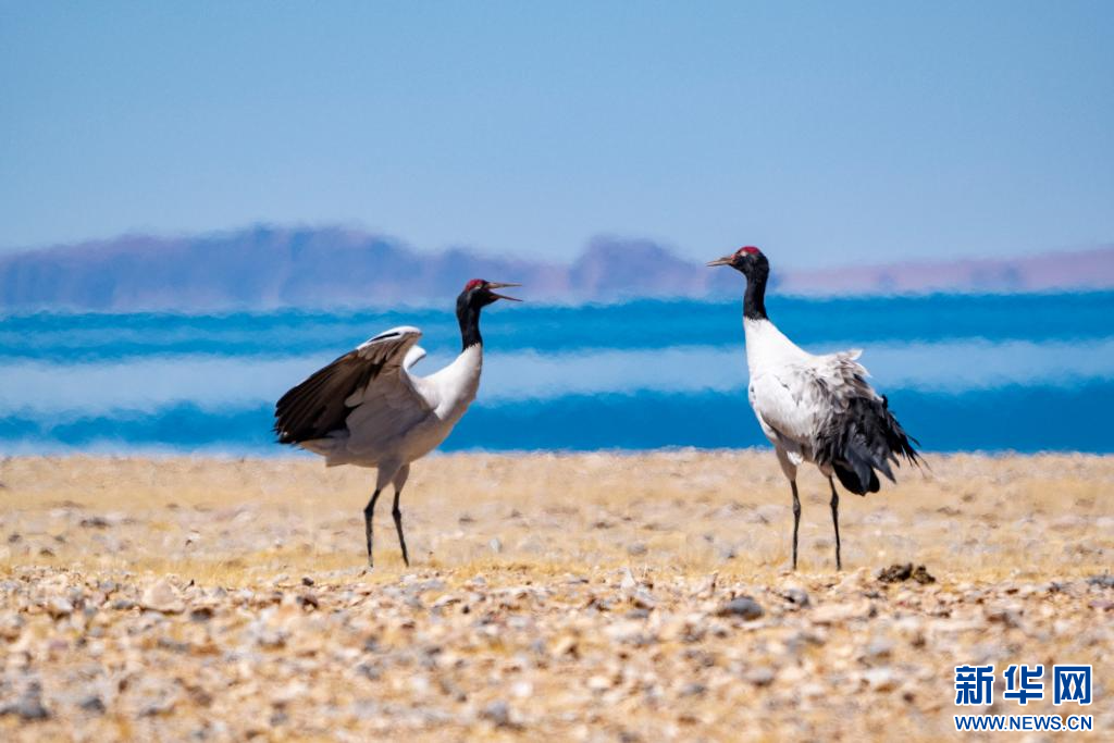4月14日,在色林錯國家級自然保護(hù)區(qū)拍攝的黑頸鶴。新華網(wǎng) 旦增努布 攝
