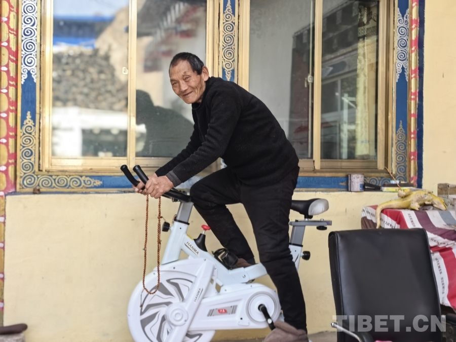 圖為卡貢村83歲的波拉正在家騎動(dòng)感單車 攝影:王淑