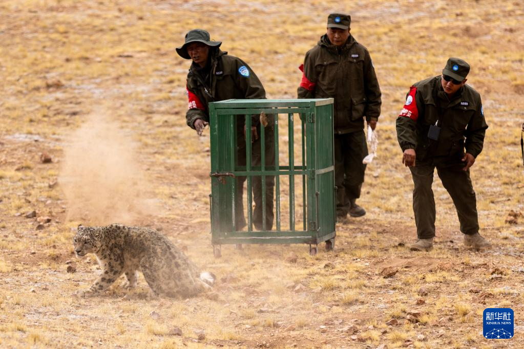 5月7日,尼瑪縣野生動(dòng)物管護(hù)隊(duì)工作人員在羌塘國家級(jí)自然保護(hù)區(qū)核心區(qū)將雪豹放歸自然。新華社記者 姜帆 攝??