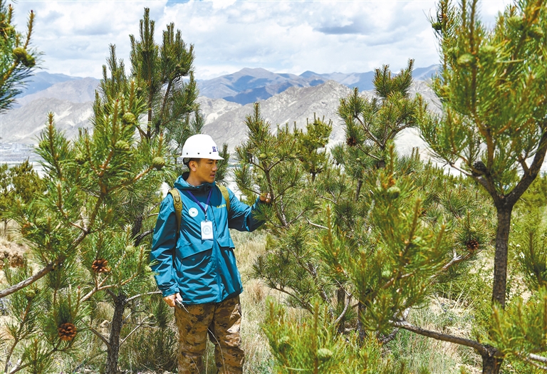 拉薩南北山綠化工程2024年度鞏固提升(貢嘎機場周邊山體)工程項目上,第三方監(jiān)理人員在檢查樹木狀況。新華社記者 晉美多吉 攝
