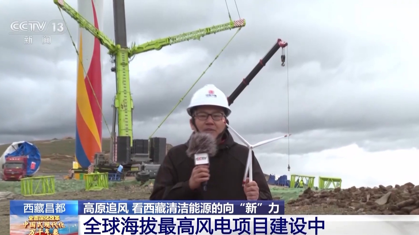 總臺記者 蔣勇:我現(xiàn)在是在西藏昌都市八宿縣全球海拔最高的風電項目——八宿風電的施工現(xiàn)場。這里的平均海拔達到5050米,最高處接近5200米。如果加上風機自身的高度,風機的最高海拔將達到5300米。西藏清潔能源十分豐富,而風能資源主要集中在5000米以上的超高海拔地區(qū)。