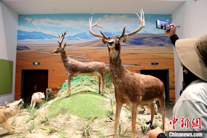 7月24日,參加“中國式現(xiàn)代化的萬千氣象·網(wǎng)絡(luò)名人青海行”活動的網(wǎng)絡(luò)名人,抵達(dá)江河源頭青海玉樹藏族自治州,在玉樹州博物館一覽自然與人文之美。玉樹州博物館是玉樹地震災(zāi)后重建十大標(biāo)志性建筑之一,分為序廳、自然展區(qū)、人文展區(qū)、臨時展廳。其通過實物標(biāo)本等方式,展示了三江源和可可西里的野生動物、草地、森林,以及玉樹州的歷史、建筑、服飾、飲食等。圖為玉樹州博物館內(nèi)的野生動物展示。中新社記者 張?zhí)砀?攝