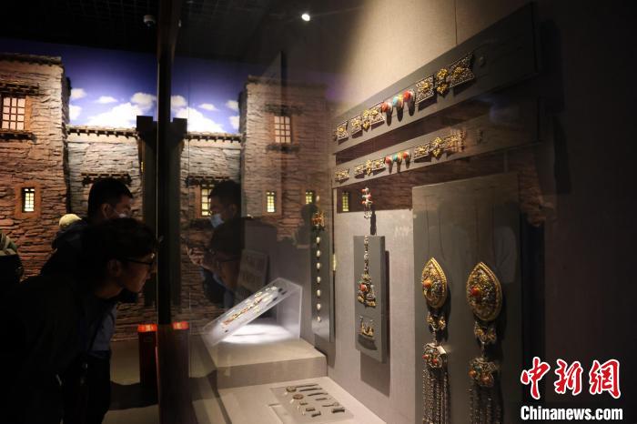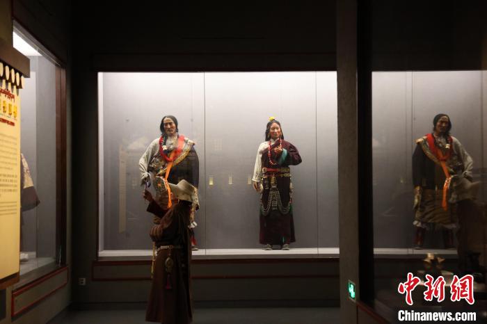 7月24日,參加“中國式現(xiàn)代化的萬千氣象·網(wǎng)絡(luò)名人青海行”活動的網(wǎng)絡(luò)名人,抵達(dá)江河源頭青海玉樹藏族自治州,在玉樹州博物館一覽自然與人文之美。玉樹州博物館是玉樹地震災(zāi)后重建十大標(biāo)志性建筑之一,分為序廳、自然展區(qū)、人文展區(qū)、臨時展廳。其通過實物標(biāo)本等方式,展示了三江源和可可西里的野生動物、草地、森林,以及玉樹州的歷史、建筑、服飾、飲食等。圖為玉樹州博物館內(nèi)的服飾文化展示。中新社記者 張?zhí)砀?攝