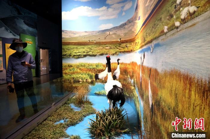 7月24日,參加“中國式現(xiàn)代化的萬千氣象·網(wǎng)絡(luò)名人青海行”活動的網(wǎng)絡(luò)名人,抵達(dá)江河源頭青海玉樹藏族自治州,在玉樹州博物館一覽自然與人文之美。玉樹州博物館是玉樹地震災(zāi)后重建十大標(biāo)志性建筑之一,分為序廳、自然展區(qū)、人文展區(qū)、臨時展廳。其通過實物標(biāo)本等方式,展示了三江源和可可西里的野生動物、草地、森林,以及玉樹州的歷史、建筑、服飾、飲食等。圖為玉樹州博物館展示的黑頸鶴棲息環(huán)境。中新社記者 張?zhí)砀?攝