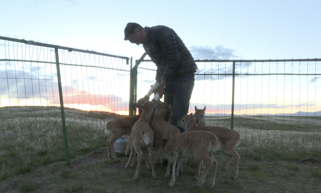 8月12日,在索南達(dá)杰保護(hù)站,保護(hù)站工作人員在給小藏羚羊喂奶。(杜笑微 攝)