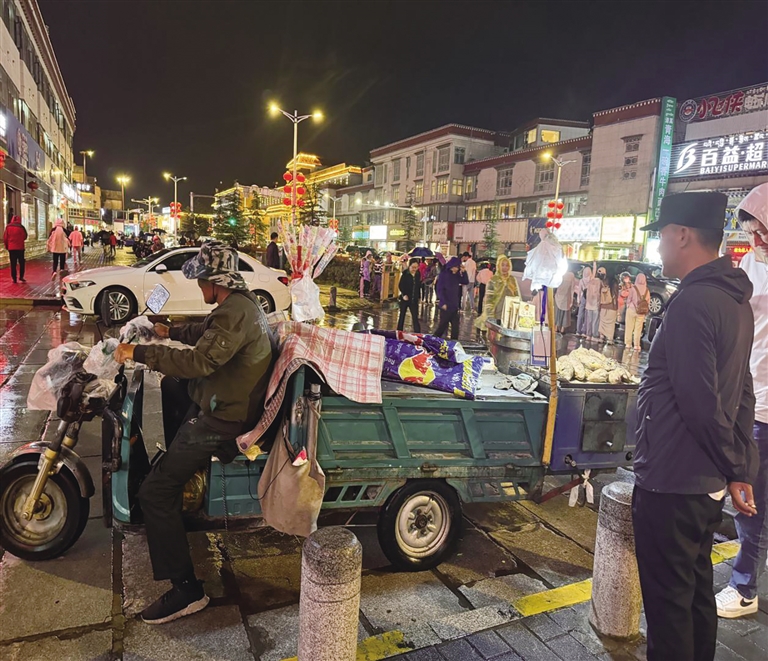 以宗角祿康停車(chē)場(chǎng)出入口為例,該區(qū)域也是流動(dòng)商販聚集區(qū),開(kāi)著電動(dòng)三輪車(chē)的流動(dòng)商販們主要售賣(mài)水果、烤紅薯、板栗等,并排停在路邊,給過(guò)往的行人造成了困擾。當(dāng)執(zhí)法人員進(jìn)行勸離后,商販們會(huì)假裝先離開(kāi),但是等執(zhí)法人員到別處巡邏時(shí)又會(huì)回到原地,周而復(fù)始。有些流動(dòng)商販全然不顧交通規(guī)則,在道路上逆行,影響了交通安全。