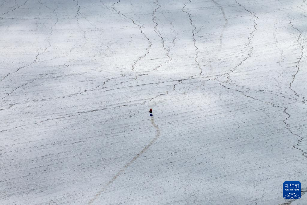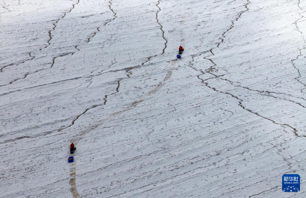 科考隊(duì)員搭乘雪地摩托前往冰原深處作業(yè)(無(wú)人機(jī)照片,9月4日攝)。新華社記者 姜帆 攝