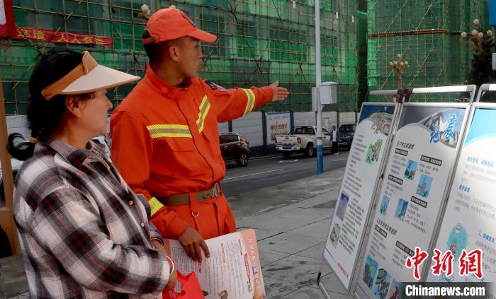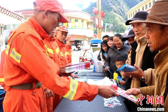 圖為消防救援人員發(fā)放宣傳手冊。費(fèi)賢浩 攝
