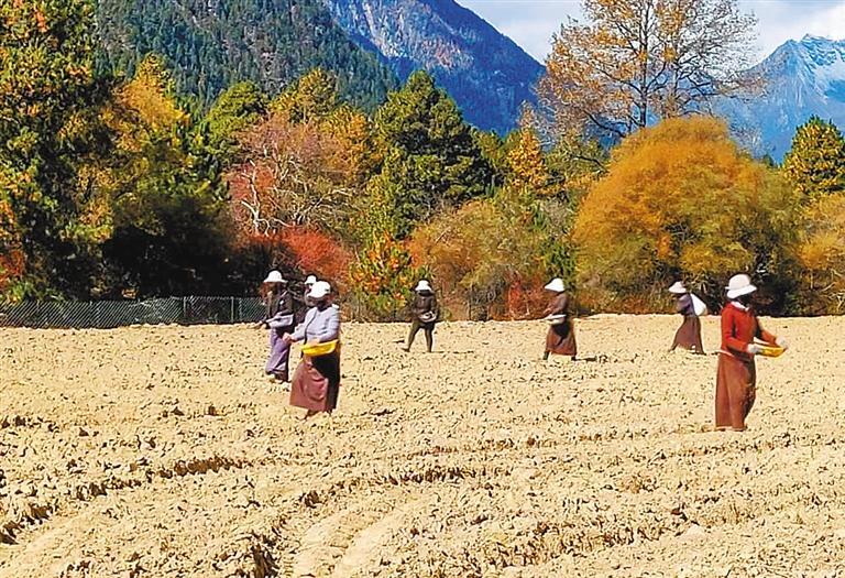 林芝市群眾在田間開展播種作業(yè)。