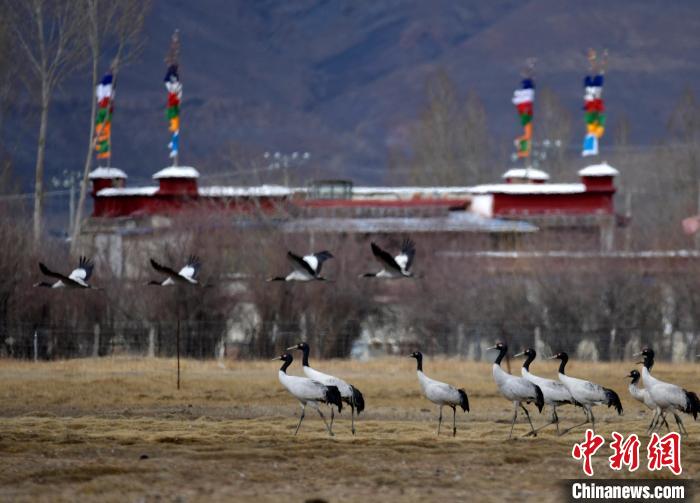 黑頸鶴是全球十五種鶴類中唯一在高原地區(qū)繁殖和越冬的鶴類,被譽(yù)為“高原神鳥”,屬中國(guó)國(guó)家一級(jí)保護(hù)動(dòng)物。每年10月中下旬左右,黑頸鶴陸續(xù)飛抵雅魯藏布江中游河谷等地越冬。圖為3月8日,棲息在西藏拉薩林周縣的黑頸鶴。中新社記者 李林 攝