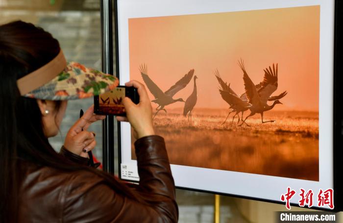 圖為觀眾拍攝黑頸鶴主題攝影展中的作品。李林 攝