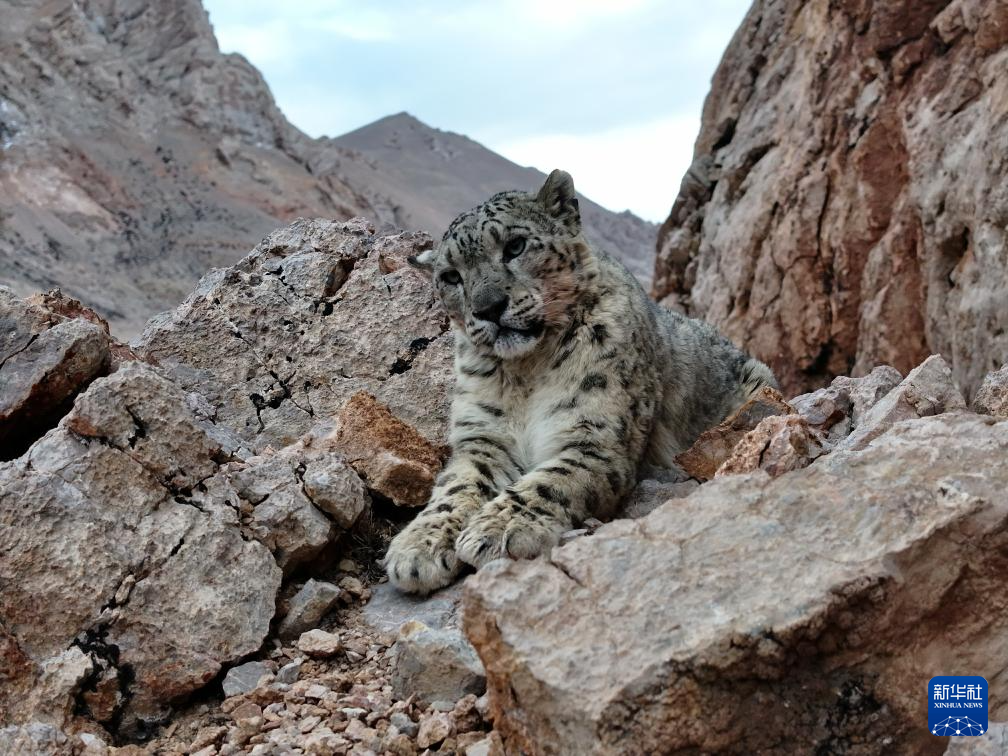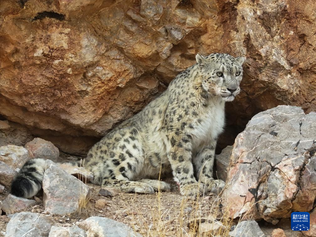 西藏阿里改則縣改則鎮(zhèn)玉多村附近巖山區(qū)域拍攝到的國家一級保護動物雪豹(4月18日攝)。新華社發(fā)(索朗仁青 攝)