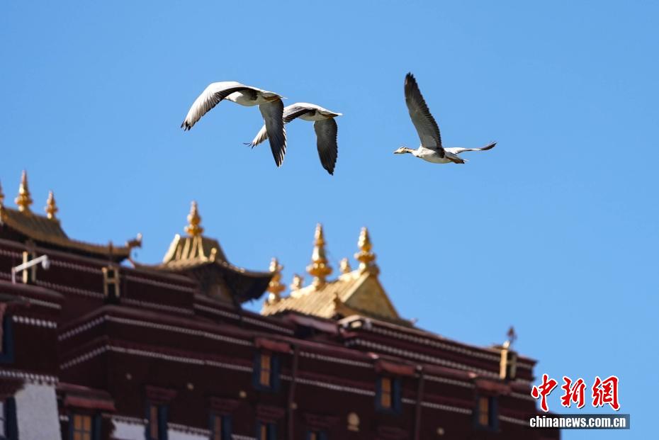 11月17日,西藏拉薩迎來大批越冬候鳥。拉薩河、宗角祿康公園等地,成為了它們的棲息天堂。在宗角祿康公園內(nèi),赤麻鴨、斑頭雁成群結(jié)隊(duì),時而低頭覓食,時而水中嬉戲。它們的身影引得市民和游客紛紛駐足觀賞、拍照留念,構(gòu)成了一幅人與自然和諧共生的美麗畫卷。圖為斑頭雁與布達(dá)拉宮同框。