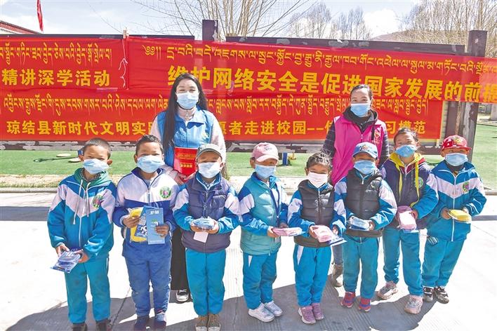 志愿者向瓊結(jié)鎮(zhèn)小學(xué)學(xué)生發(fā)放學(xué)習(xí)用具,開展“綠書簽”活動。記者 洛桑 次旺 攝