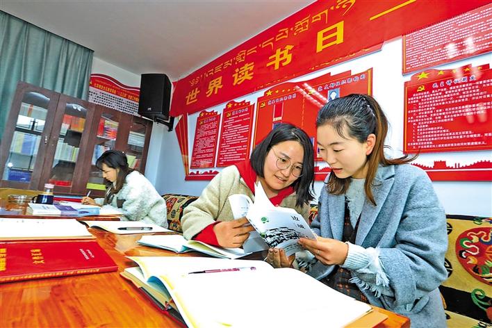 拉薩市墨竹工卡縣教育局干部職工在黨員活動室內(nèi)閱讀圖書。洛克 記者 唐斌 攝