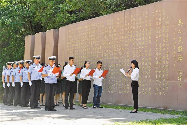 6月29日,在延安市張思德廣場,黨員干部在誦讀《為人民服務(wù)》。新華社記者 張博文 攝
