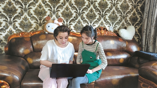 圖為閑暇時間,次仁白珍(右)和媽媽一起看舞蹈視頻,研究舞蹈動作。 拉薩融媒記者 余洋洋攝