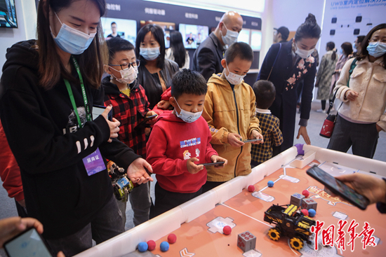 11月1日,山西太原,中國(guó)(太原)人工智能大會(huì)主題展覽現(xiàn)場(chǎng),一家主打人工智能和機(jī)器人的高科技創(chuàng)新公司研發(fā)的機(jī)器人競(jìng)技類游戲吸引了許多小朋友駐足體驗(yàn)。10月31日,中國(guó)(太原)人工智能大會(huì)舉辦,大會(huì)主題展覽同步舉行,40余個(gè)展位集中展示當(dāng)前人工智能產(chǎn)業(yè)核心技術(shù)、產(chǎn)品和創(chuàng)新成果。