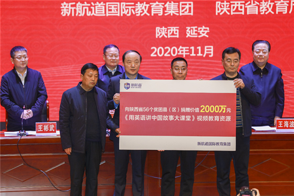 2020年是脫貧攻堅(jiān)的決戰(zhàn)決勝之年。繼陜西省56個(gè)貧困縣(區(qū))全部實(shí)現(xiàn)“脫貧摘帽”之后,又收到一份教育大禮——由新航道國(guó)際教育集團(tuán)捐贈(zèng)的價(jià)值2000萬(wàn)元的《用英語(yǔ)講中國(guó)故事》視頻課程。當(dāng)天,陜西省教育廳副廳長(zhǎng)王海波與新航道國(guó)際教育集團(tuán)董事長(zhǎng)兼CEO胡敏共同出席在宜川中學(xué)舉行的捐贈(zèng)儀式,開(kāi)啟新航道國(guó)際教育集團(tuán)助力陜西教育扶貧的新篇章。