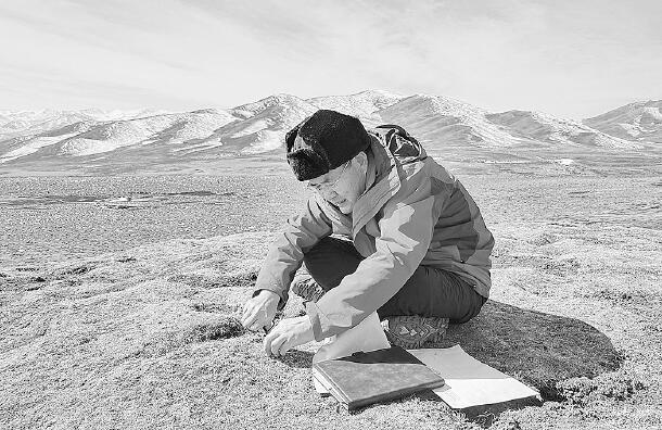 趙新全在青海省海南藏族自治州貴德縣采集牧草樣品(2020年2月29日手機(jī)拍攝)。新華社發(fā)