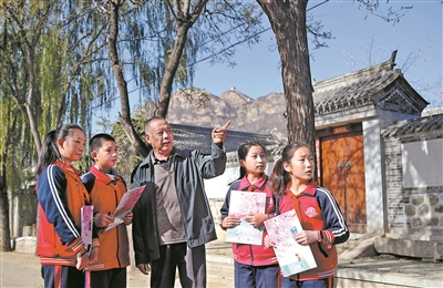 長(zhǎng)城腳下美麗的河西村為什么會(huì)有137個(gè)姓氏?走在村中古樸的小路上,聆聽(tīng)老支書(shū)張玉山的講述,古北口鎮(zhèn)中心小學(xué)學(xué)生探尋河西村多民族、多姓氏融合的“百姓村”成因。樊世剛 攝