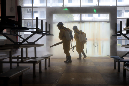 2020年3月22日,湖南省長(zhǎng)沙市明德啟南中學(xué),消殺防疫隊(duì)員在食堂進(jìn)行例行消毒。陳澤泉/攝