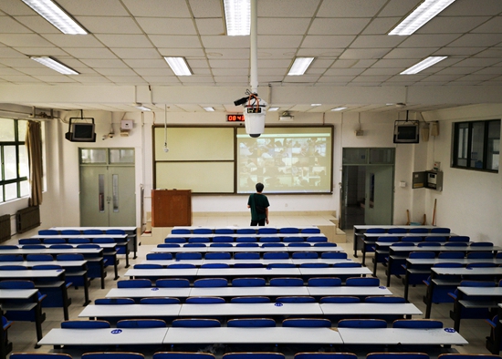 2020年7月14日,山東省青島市,一名教師在山東科技大學(xué)一間空曠的教室里通過(guò)屏幕進(jìn)行“云”監(jiān)考。受疫情影響,該校采用線上的方式進(jìn)行期末考試。孫德波/攝