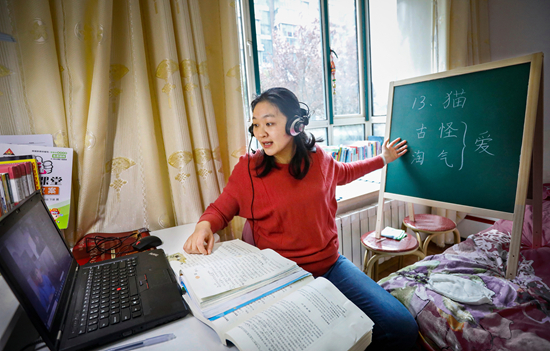 2020年3月25日,江蘇省連云港市,一名小學(xué)語(yǔ)文教師在家中給學(xué)生線上授課。受疫情影響,學(xué)校提倡 “停課不停學(xué)”,號(hào)召學(xué)生在家上課。張曉青/攝