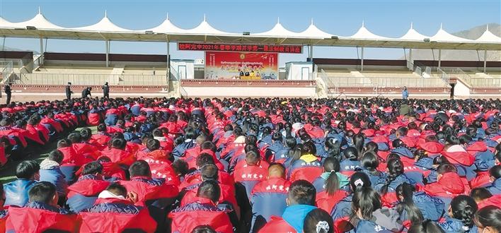 圖為拉薩阿里河北完全中學(xué)師生在校運(yùn)動(dòng)場(chǎng)舉行2021年春季開(kāi)學(xué)典禮。圖片由拉薩阿里河北完全中學(xué)提供