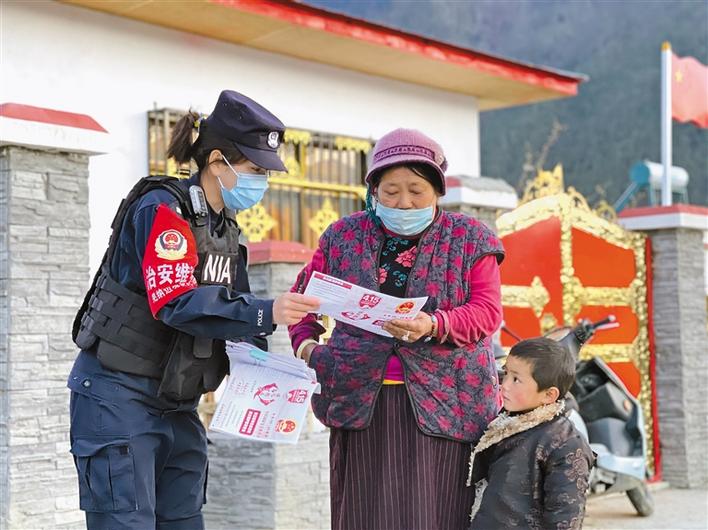 圖為林芝邊境管理支隊羌納邊境派出所民警為群眾發(fā)放國家安全教育宣傳手冊。孫彪 張猛 攝