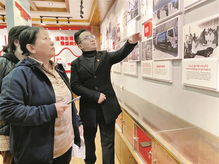 圖為在嘎瑪貢桑社區(qū)居委會(huì)“居史館”內(nèi),社區(qū)黨總支副書(shū)記、居委會(huì)主任尼瑪次仁帶領(lǐng)轄區(qū)干部群眾了解社區(qū)歷史。 拉薩融媒記者 旦增拉珍攝