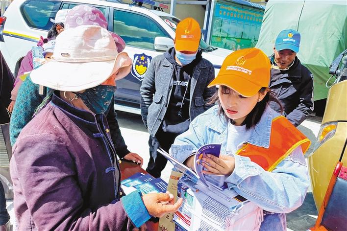 圖為洛扎縣普法宣傳人員為過往群眾發(fā)放法治宣傳資料。記者 巴桑旺姆 攝