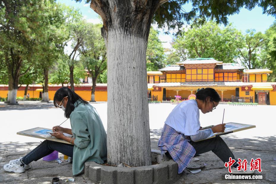 圖為西藏大學(xué)建筑系學(xué)生正在手繪羅布林卡內(nèi)的建筑。 中新社記者 貢嘎來松 攝