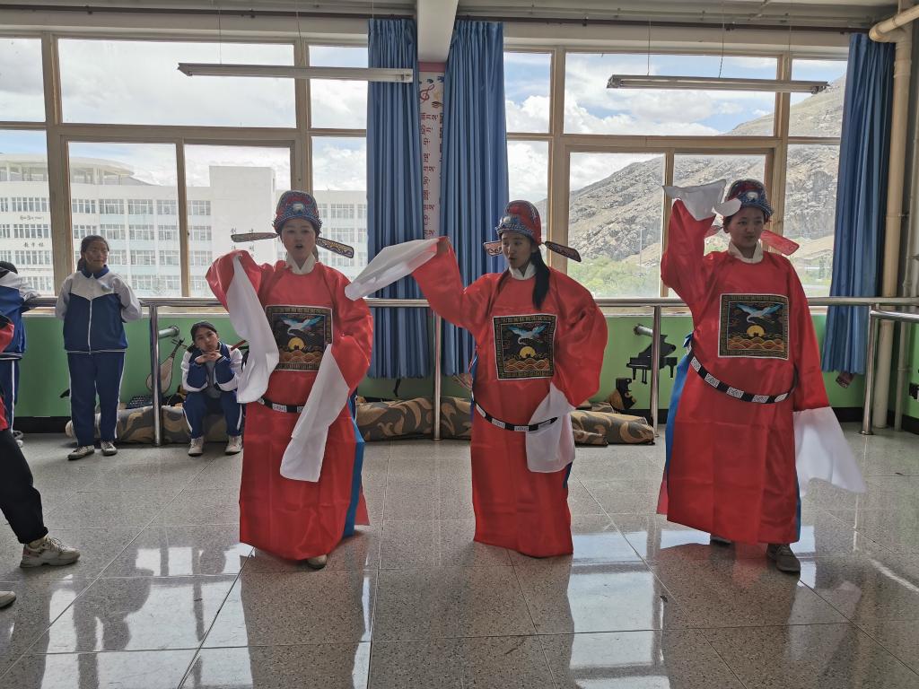 幾天相處下來,她看到藏族孩子能歌善舞的天性,便主動(dòng)把家鄉(xiāng)的黃梅戲表演給學(xué)生。隨著學(xué)生對(duì)黃梅戲愈發(fā)好奇,金慧琳組建了全區(qū)首個(gè)藏漢雙語黃梅戲?qū)W生社團(tuán),并以黃梅戲代表性曲目《女駙馬》為藍(lán)本,以藏式歌舞為表現(xiàn)形式,進(jìn)行創(chuàng)造性轉(zhuǎn)化和創(chuàng)新性發(fā)展。
