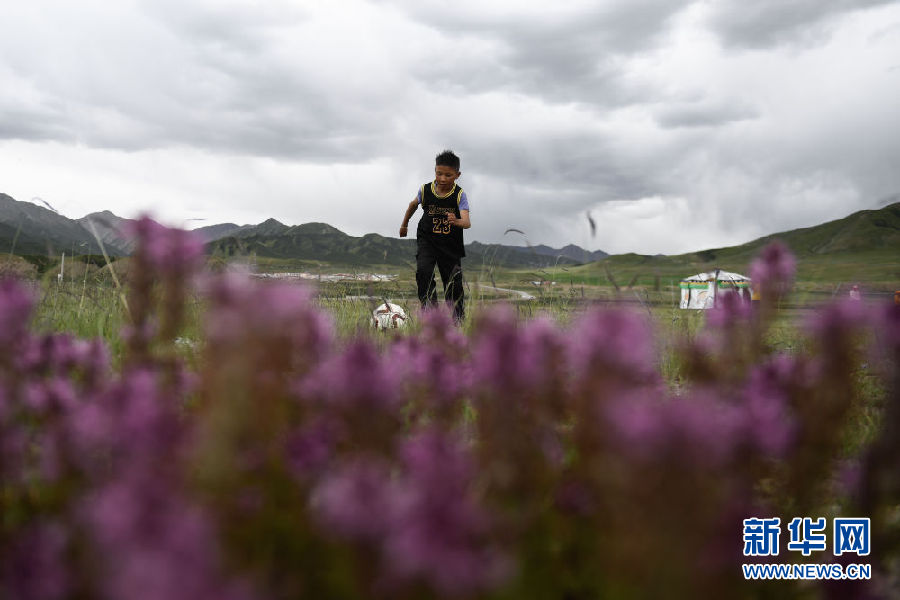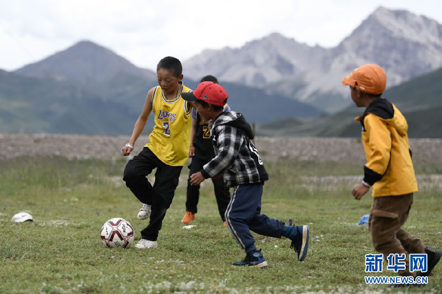 8月2日,在青海省果洛藏族自治州瑪沁縣下大武鄉(xiāng)年扎村的“育苗加油站”,普毛扎西在踢球。新華社記者 張龍 攝