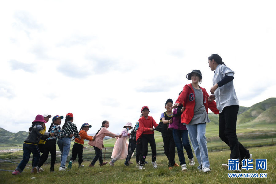 8月2日,在青海省果洛藏族自治州瑪沁縣下大武鄉(xiāng)年扎村的“育苗加油站”,孩子們在一起玩游戲。新華社記者 張龍 攝