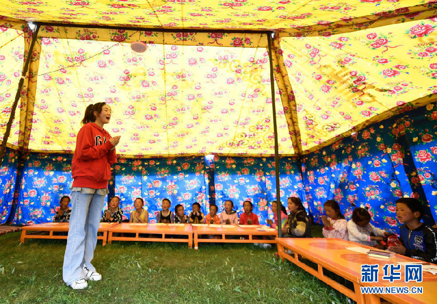 8月2日,在青海省果洛藏族自治州瑪沁縣下大武鄉(xiāng)年扎村“育苗加油站”的帳篷里,大學(xué)生鬧日卓瑪在教孩子們唱歌。新華社記者 張龍 攝