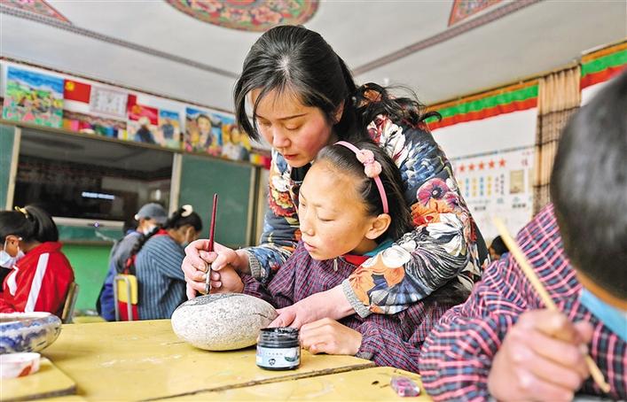 圖為山南市洛扎縣中學(xué)的學(xué)生正在學(xué)習(xí)石頭畫。記者 唐斌 次旺 攝